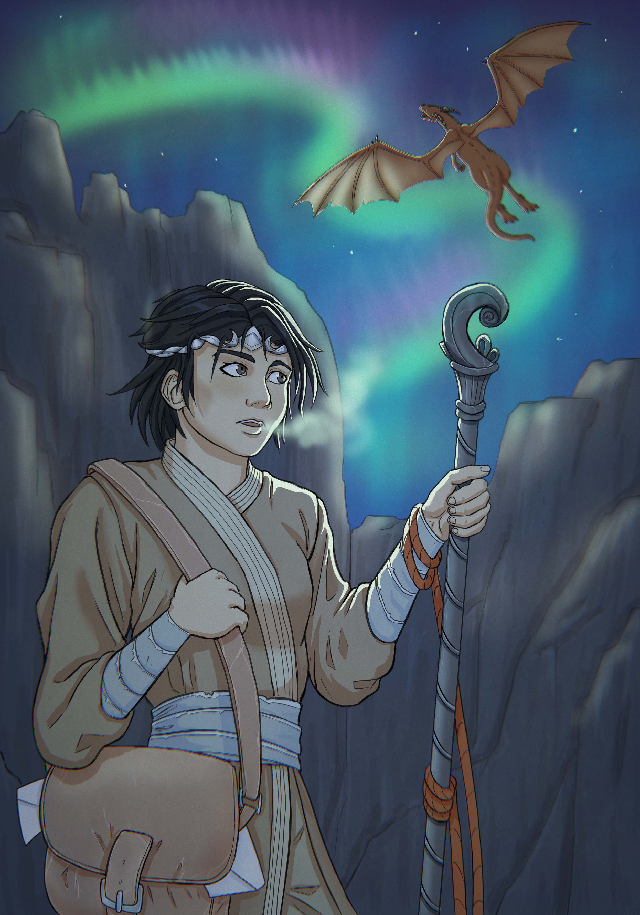 an illustration of a wizard and a boy approaching a city