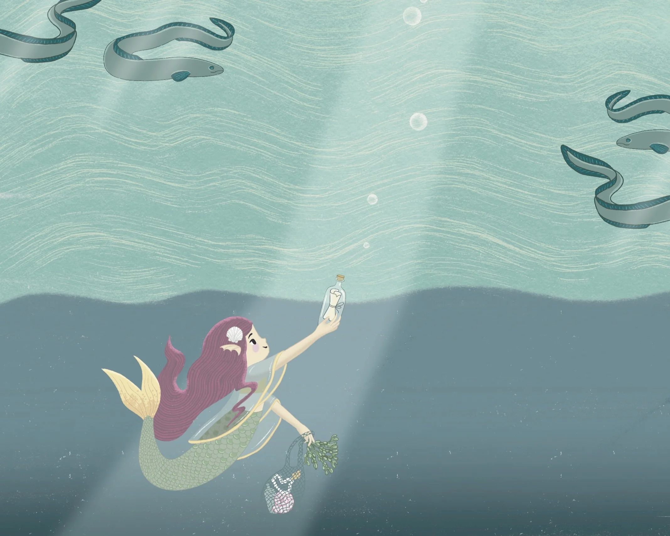 a picture of a girl sending a message in a bottle to a mermaid